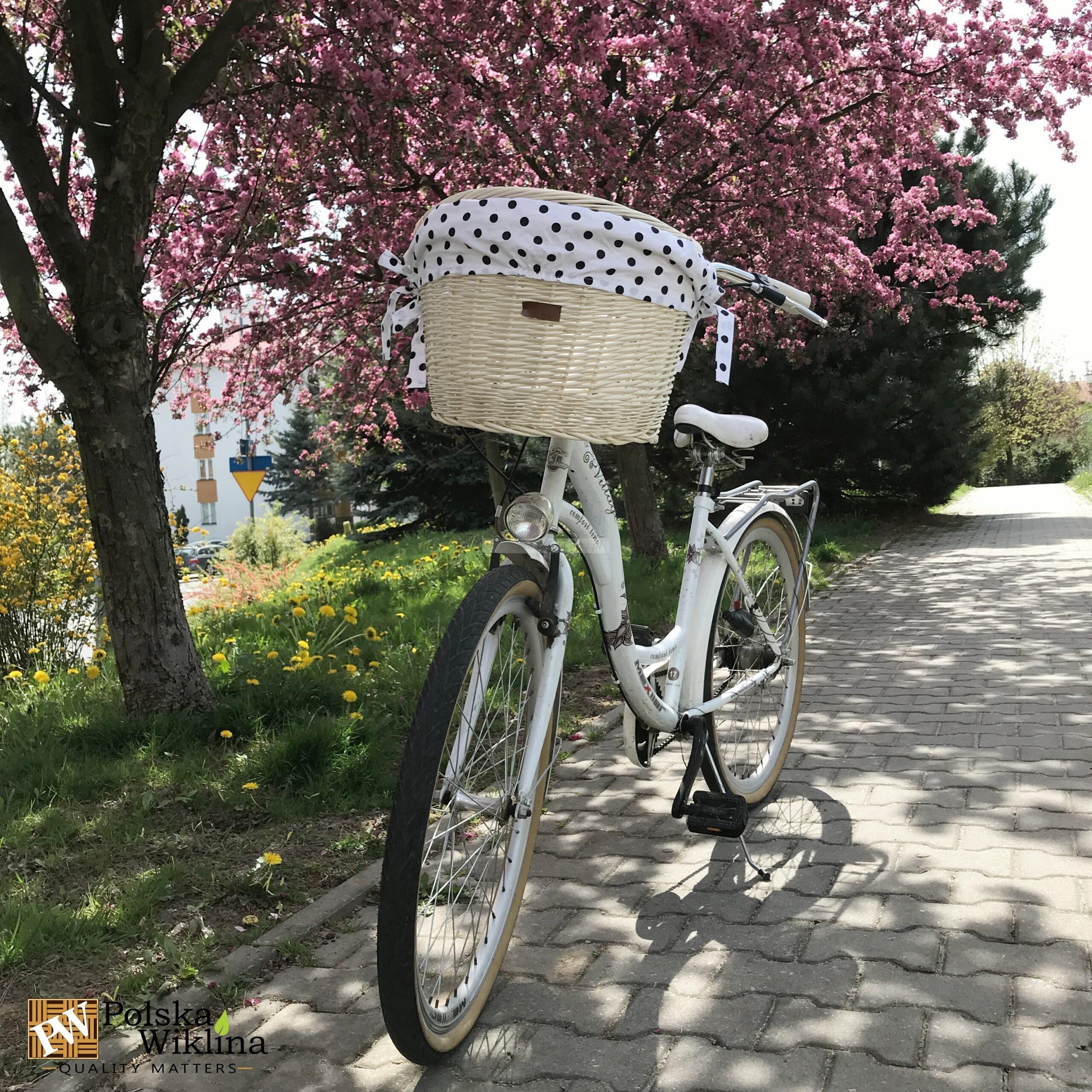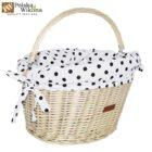 Kosz na rower wiklinowy kremowo-biały wkład biały w czarne grochy
