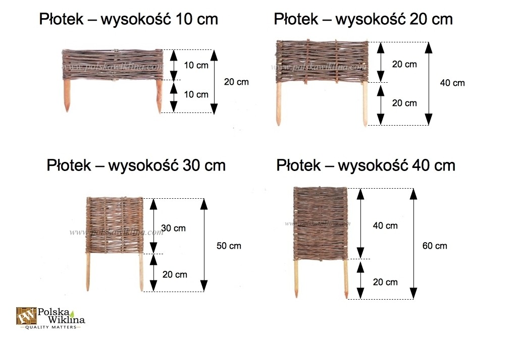 | Specyfikacja | Płotek wiklinowy (inaczej palisada wiklinowa) wykonany jest ręcznie z drewnianych kołków. Wiklina jest nieokorowana. Płotek może być używany jako przegroda kwiatów, krzewów lub po prostu, jako nietuzinkowa i efektowna dekoracja ogrodu,. |